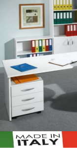 Linea operativa in melaminico E1 . Struttura scrivanie sp. 22mm com bordo ABS  sp. 1 mm .  Cassettiera ed ante legno senza serratura (e possibile aggiungere la serratura come optional al costo di € 15,60, codice prodotto  11053) .  Cassettiera spedita smontata