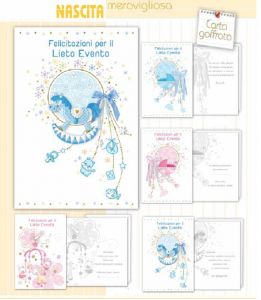BIGLIETTI AUGURI NASCITA - CARTA BRISTOL - FORMATO CHIUSO 11,5x17 cm - 4 SOGGETTI - conf. 24 pz