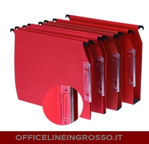 Realizzate in cartoncino arancio kraft ad alta resistenza da 220 g/m2. Barrette di sospensione in Polistirene nero antiurto. Portaetichette in materiale plastico lenticolare con sistema ad incastro per il collegamento in continuo delle cartelle. Fondo a U con base rinforzata in cartoncino nero.