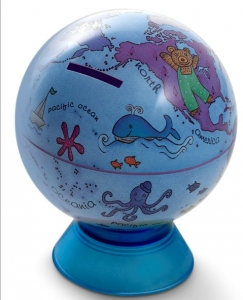 MAPPAMONDO BABY BANK SALVADANAIO CON BASE LENTE DI INGRANDIMENTO DIMENSIONI: (DIAM. 11 cm) ( H 15cm)