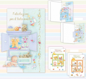 BIGLIETTI AUGURI NASCITA - CARTA BRISTOL - FORMATO CHIUSO 11,5x17 cm - 4 SOGGETTI - conf. 24 pz