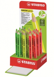 Espositore in cartone con blocchetto prova - Dimensioni:100x90x212 mm - Assortimento: 9 gialli - 6 arancio - 6 verdi ECOLOGICO: il suo corpo in legno certificato FSC®* e le scatole di cartone riciclato ne fanno un prodotto rispettoso dell'ambiente al 100%. ORIGINALE: matita a sezione triangolare, fusto corto e con le inconfondibili strisce bianche STABILO. QUALITÀ: mina XL (5,5 mm), solida e facile da temperare. 3 COLORI fluorescenti: giallo, verde e rosa, ideali per stampe a getto d'inchiostro, tutti i tipi di carta, fotocopie e fax. * Forest Stewardship Council: Il marchio FSC® è riconosciuto da tutte le organizzazioni governative e certifica la provenienza del legno da foreste gestite nel rispetto degli alberi e delle popolazioni. STABILO è stata la prima azienda di strumenti di scrittura a certificarsi FSC®.